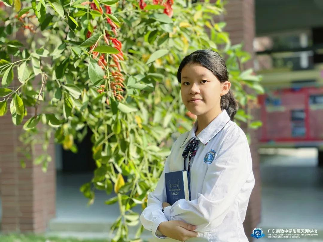 校大队部学习部成员,校合唱团声部长。爱好唱歌,声乐十级。曾获第十八届中国日报社“21世纪杯”中学生英语演讲大会广东赛区二等奖、亚洲青少年艺术盛典声乐少儿A组银奖、广州市第十三届学校合唱比赛特等奖、广州市第十四届中小学合唱节中学组一等奖、“天宫杯”天河区第十四届合唱节一等奖。