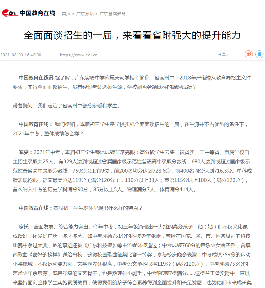中国教育在线讯 据了解,广东实验中学附属天河学校(简称:省实附中)2018年严格遵从教育局招生文件要求,实行全面面谈招生。没有经过考试选拔生源,学校能否延续既往的辉煌成绩?