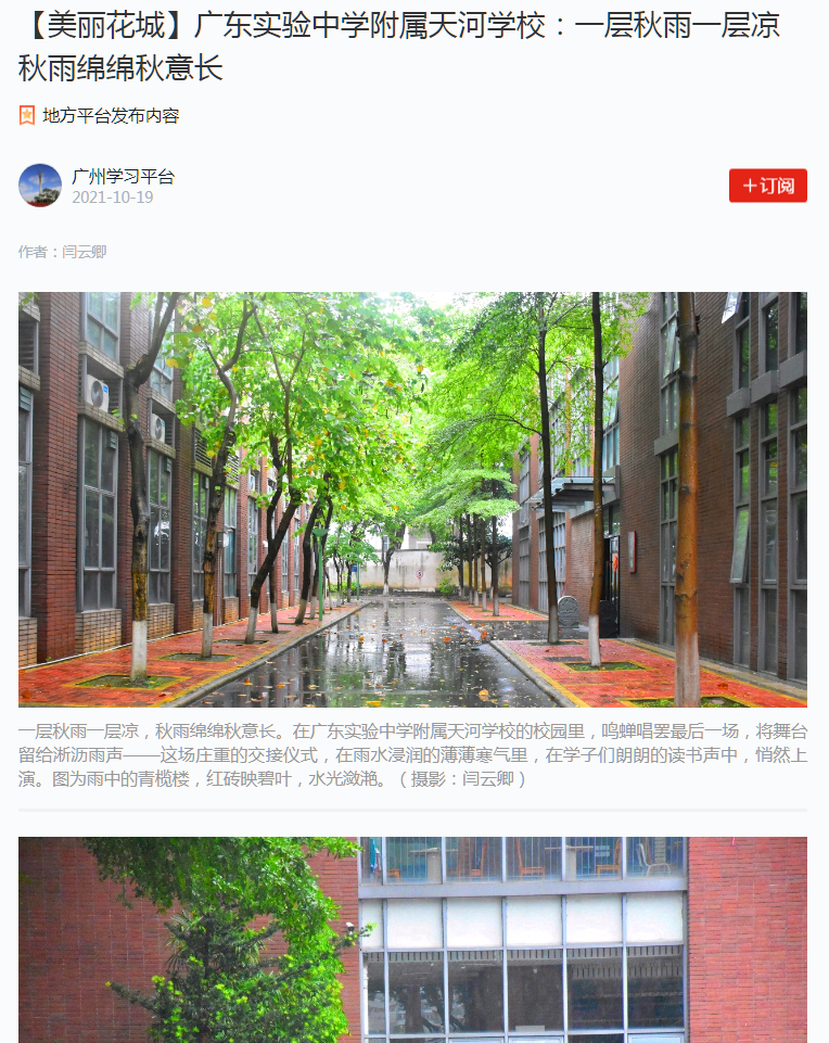 一层秋雨一层凉,秋雨绵绵秋意长。在广东实验中学附属天河学校的校园里,鸣蝉唱罢最后一场,将舞台留给淅沥雨声——这场庄重的交接仪式,在雨水浸润的薄薄寒气里,在学子们朗朗的读书声中,悄然上演。图为雨中的青榄楼,红砖映碧叶,水光潋滟。(摄影:闫云卿)
