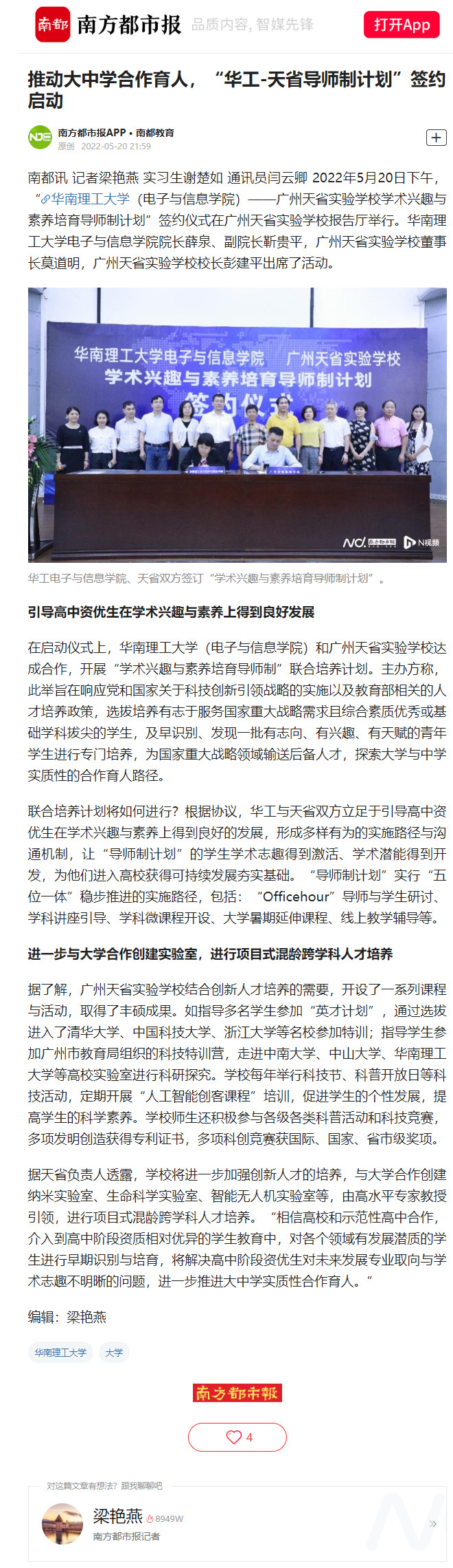 广州日报、羊城晚报、南方都市报:华工电子与信息学院与天省实验学校开展联合培养计划