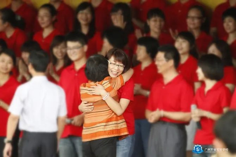 (初中毕业典礼上,王双老师与黄玉凤校长深情拥抱。)