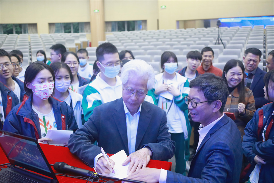 在两个小时的精彩课堂里,何院士如同和朋友聊天一般娓娓道来,在轻声笑语之中引领师生拓宽发展视野,思考“如何让自己的生命更加有价值和有意义”,并以生动的例子向大家展示了理想的美好、生命的美好、奋斗的美好、不怕输的美好。 “在培养学生的过程中,我往往会和他们讲首先要学会做人,服务社会的前提是要自身品德修养过硬,以奋斗的人生打动人,以高尚的情操塑造人,以优异的人品感染人。”何院士深情寄语同学们:“作为新时代的奋斗者、建设者要练好做人做事的基本功、要树立远大的奋斗目标、要过好人生每一关,为民族振兴和人类幸福而奋斗终生。”课后同学们热情地围在何院士身旁,求教问题。“何院士是我们理想人生的标杆,他的奋斗精神和签名,将时刻激励着我为未来的科技事业积极奋进!”黄同学说。