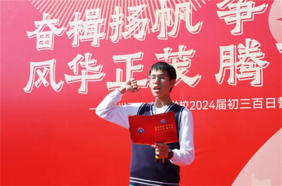 初三学部副主任王双满怀对莘莘学子的无限期望,带领全体教师手举右拳,庄严宣誓。老师们的誓言铿锵有力,掷地有声,表达了全体初三教师无私奉献、敬业乐教、精准备考,与学生同心同行、共沐风雨,帮助同学们圆梦中考的坚定信念。 在学生代表钟翰祺带领下,全体同学用自信而豪迈的声音,喊出铿锵有力的立志宣言,气贯长虹,斗志昂扬,展现了天省学子决战中考的勇气和力量。