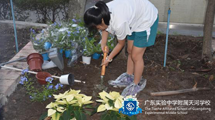 最近,广东实验中学附属天河学校初一的同学们放学后都直奔生物园,迫不及待地当“花匠”。原来,该校初中一年级18个班级中开展了“争创最美班级后花园”活动。每个班在学校生物园种植区“承包”一块花圃,把劳动教育、生态教育和环境教育结合在一起。